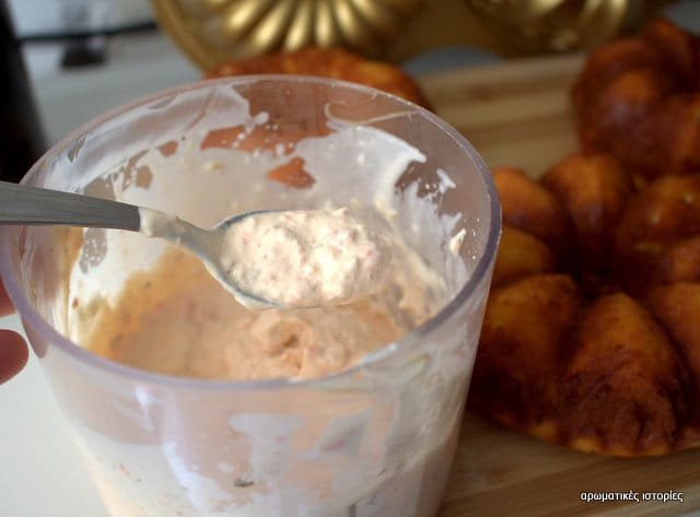 Μόλις ψηθεί το αφήνω για άλλα 10΄με κλειστή τη θερμοκρασία και στη συνέχεια τα βγάζω από τις φόρμες. - Μία αλοιφούλα με φιστίκι, κόκκινη πιπεριά, πρόβειο γιαούρτι και κατίκι συνοδεύει το κέικ.