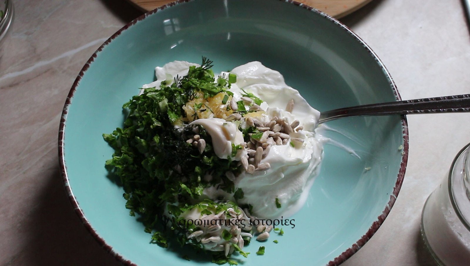 - Πασπαλίζω με ψιλοκομμένο φρέσκο κρεμμυδάκι, ελαιόλαδο και σουμάκι.