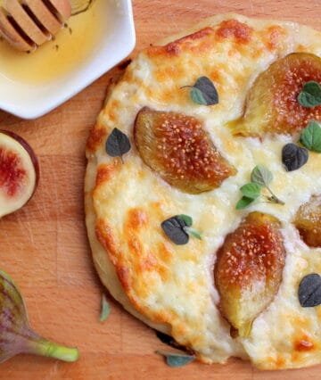 Πίτσα με ανεβατό, κασέρι, φρέσκα σύκα, ρίγανη και μέλι. Pizza with anevato cheese, kaseri, fresh figs, fresh origano and honey.