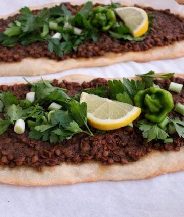 Λαχματζούν με γέμιση φακής αρωματισμένη με σουμάκι, θρούμπι και κίμινο. Lahmacun with lentils, satureja, thymbra and cymin.
