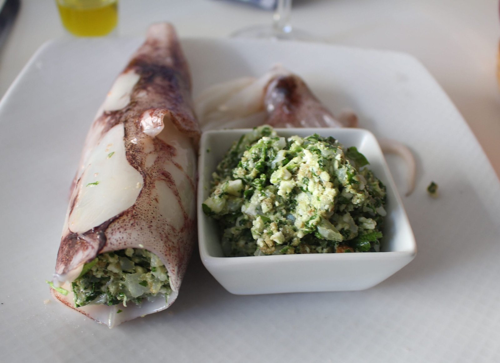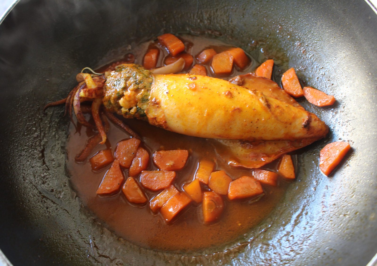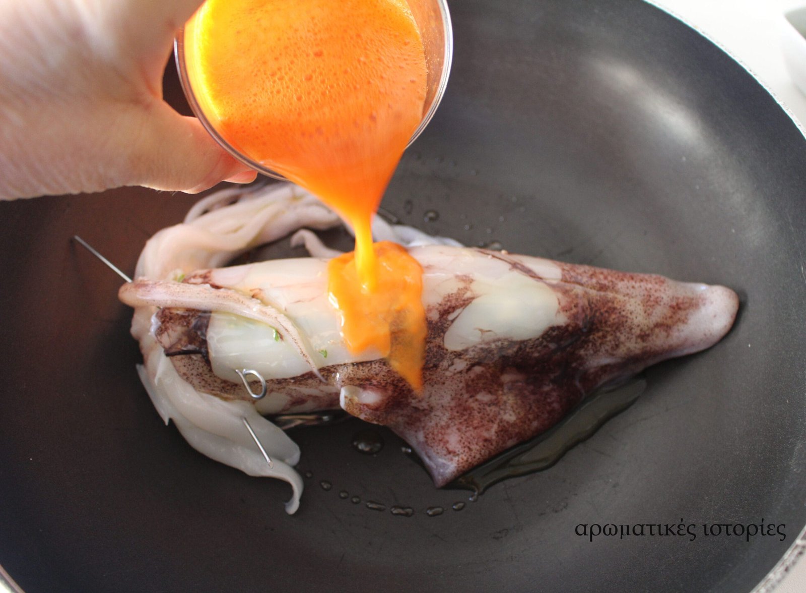 λεπτάΚαλαμάρι γεμιστό με κιμά σουπιάς μαγειρεμένο σε χυμό καρότου και ροζέ κρασί