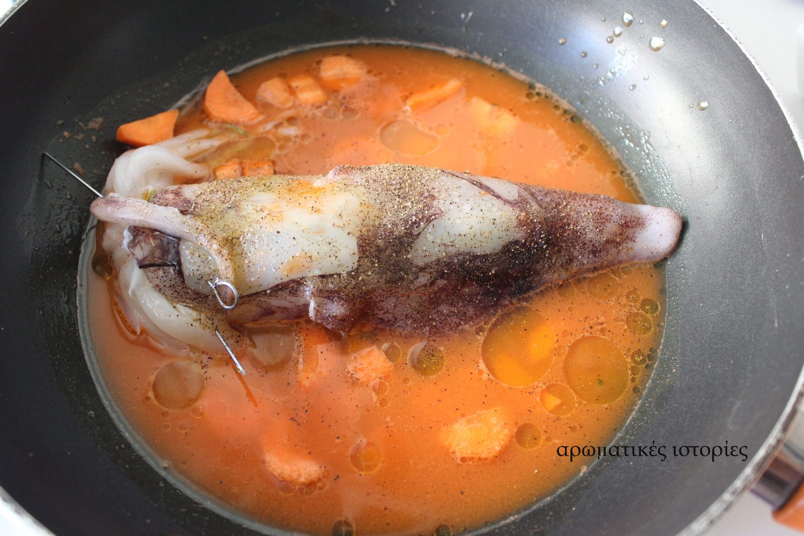 - Βάζω ελαιόλαδο σε ένα βαθύ τηγάνι, ακουμπώ απαλά το καλαμάρι και προσθέτω το χυμό καρότου, το ροζέ κρασί, τα καροτάκια, αλάτι και πιπέρι.