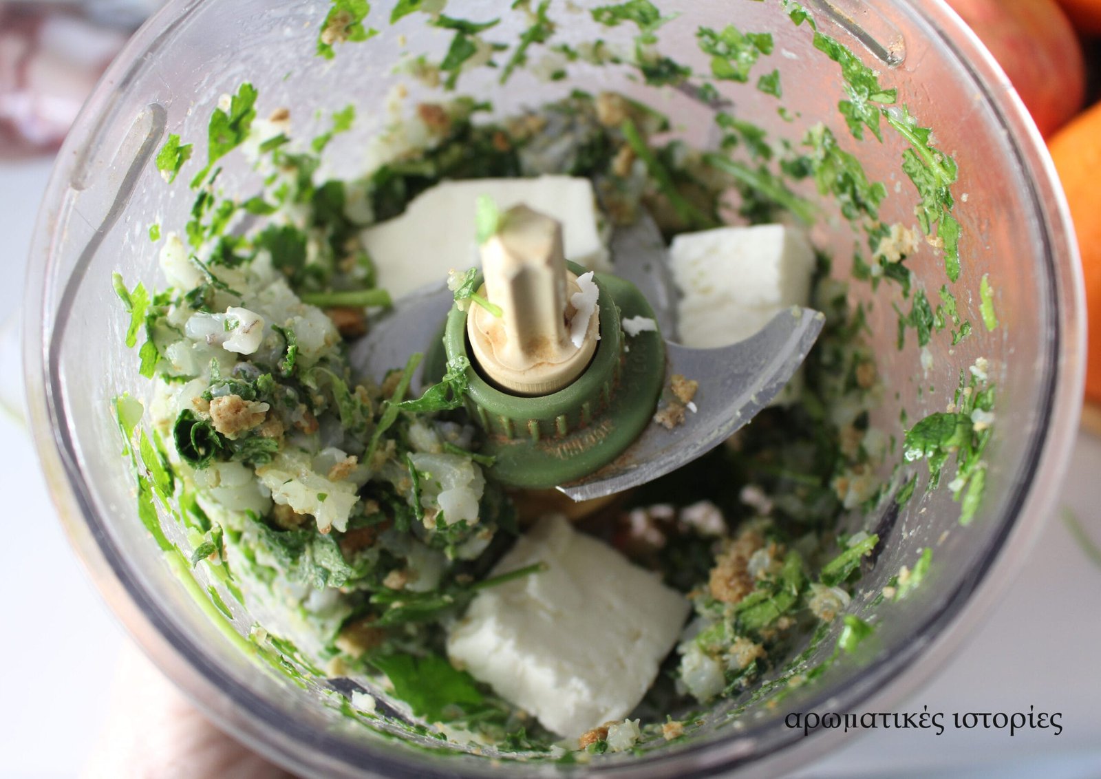 - Με το καθάρισμα των θαλασσινών δεν ασχολήθηκα, τα είχε ήδη έτοιμα ο καλός κύριος στο ιχθυοπωλείο. Βάζω στον πολυκόφτη τη σουπιά χωρίς το κεφάλι της, το παξιμάδι, τον μαϊντανό, το ελαιόλαδο, αλάτι, πιπέρι, κάνω ένα άλεσμα και προσθέτω και τη φέτα.