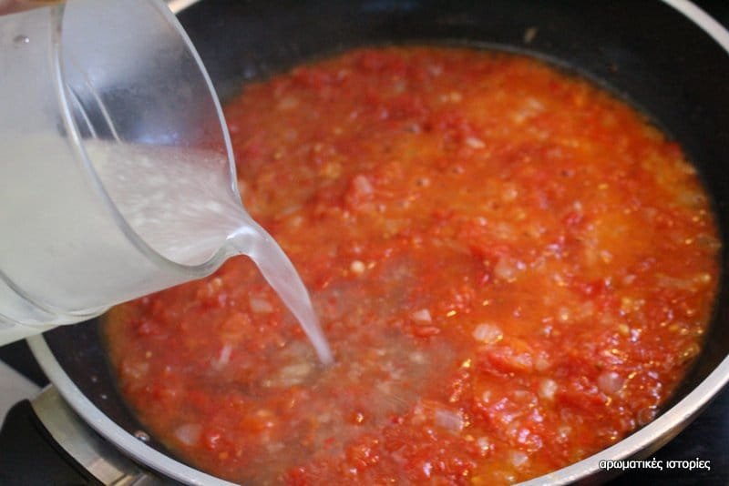 - Ψιλοκόβω το κρεμμύδι και το αχνίζω για λίγα λεπτά στο ελαιόλαδο. Σβήνω με το κρασί, προσθέτω την ντομάτα, τη σάλτσα και σιγοβράζω για 10΄. Προσθέτω το ζωμό, αλάτι, πιπέρι και κλείνω τη θερμοκρασία της εστίας.