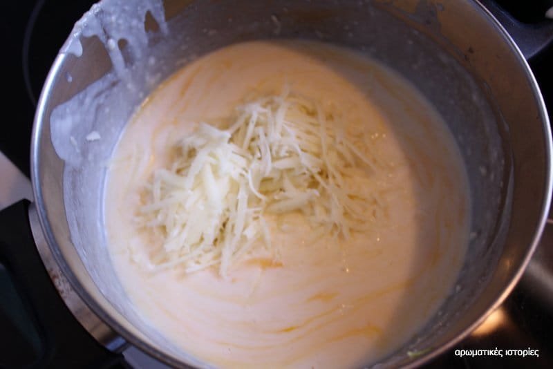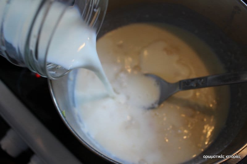 - Λιώνω το βούτυρο και προσθέτω το αλεύρι. Ψήνω για λίγα λεπτά το μείγμα και προσθέτω ζεστό το γάλα ανακατεύοντας συνεχώς έως ότου δέσει το μείγμα.