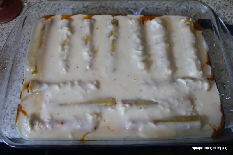 - Απλώνω πάνω από τα κανελόνια την μπεσαμέλ, καλύπτω με λαδόχαρτο και ψήνω στους 180ο για 40΄.