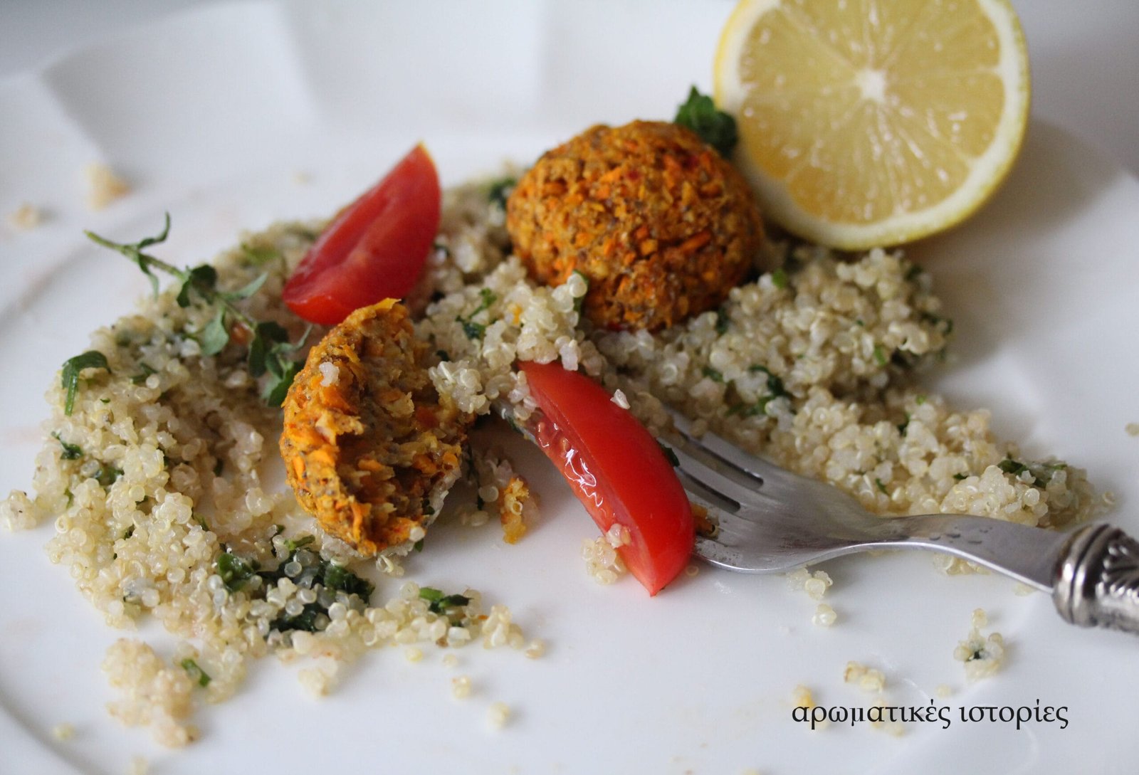 Η ώρα του μεσημεριού ήταν δύσκολη. Τα κλαδάκια της ρίγανης πετούσανε γύρω γύρω στο πιάτο. Ένα τσουλούφι από τα μαλλιά μου επέμενε να τρυπάει συνεχώς το μάτι μου παρόλο που με επιμέλεια είχα συμμαζέψει το ατίθασο σγουρό του κεφαλιού μου. Οι δε σταγόνες λεμονιού δεν πήγαιναν όπου στόχευα και επειδή τα χέρια μου πάγωναν παράτησα το εφέ αυτό. H φωτογράφιση πιάτου έξω από το σπίτι με τον χειμωνιάτικο αέρα να σε τυρρανάει, είναι μεγάλος μπελάς. Ευτυχώς ήταν τόσο ευχάριστη η προετοιμασία του φαγητού και τόσο ασυνήθιστα όμορφα τα πορτοκαλοκόκκινα κεφτεδάκια, που αγόγγυστα υπέμενα το κρύο.