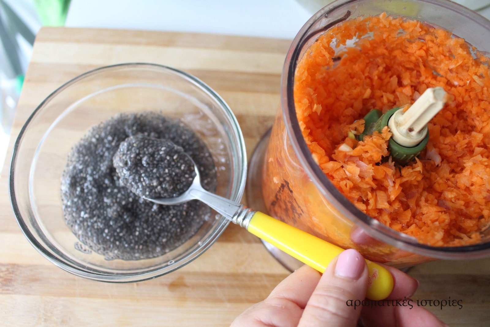• Καθαρίζω και πλένω τα λαχανικά, καρότο – κρεμμύδι – σκόρδο και τα βάζω στον πολυκόφτη να αλεστούν. Θέλω να κάνω τη ζωή μου εύκολη χωρίς επίπονο τρίψιμο στο ρεντέ, όπου πάντα σκαλώνει ένα νύχι και το κλαίω μετά. Το μαγικό με το καρότο είναι ότι ενώ ο κεφτές είναι από έξω ξεροψημένος και όταν το πιάνεις λες θα είναι στεγνό, από μέσα οι χυμοί του καρότου το κάνουν απίστευτα ζουμερό.