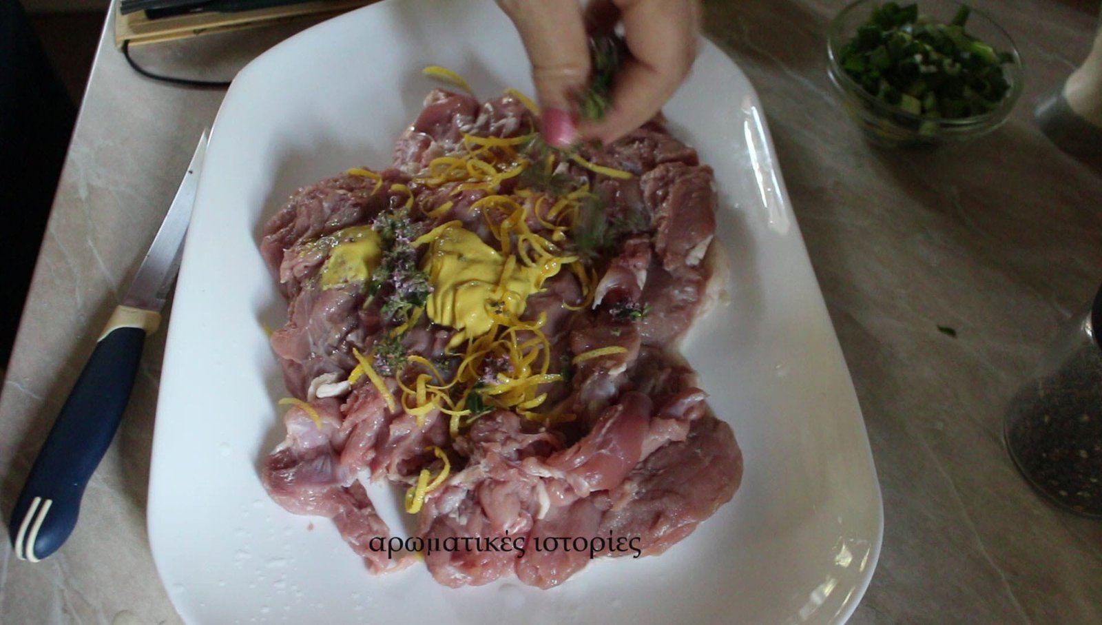 - Ανοίγω το κομμάτι το χαράζω ελαφρά εδώ και εκεί. Αλείφω με τη μουστάρδα, το ξύσμα, το χυμό λεμονιού, το θυμαράκι ψιλοκομένο, αλάτι και πιπέρι.