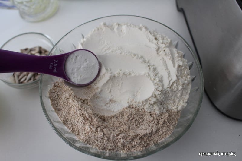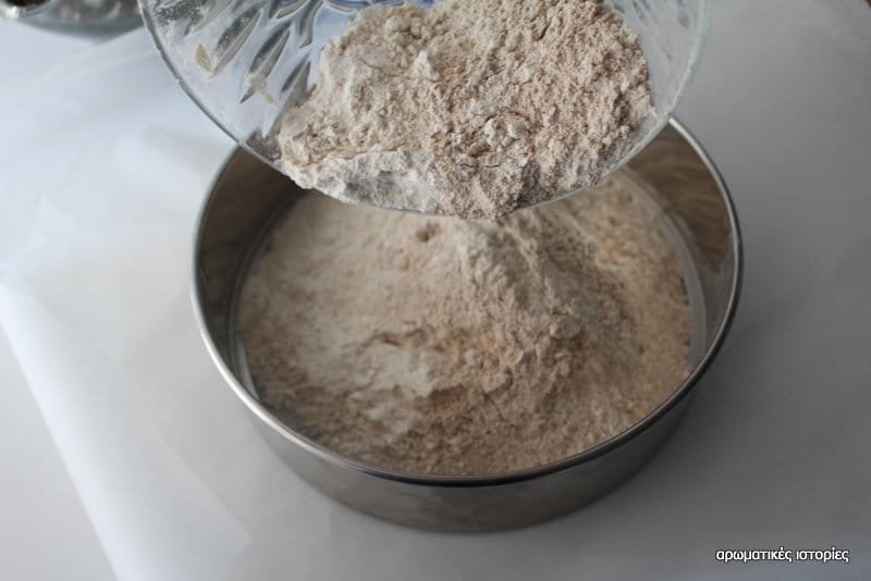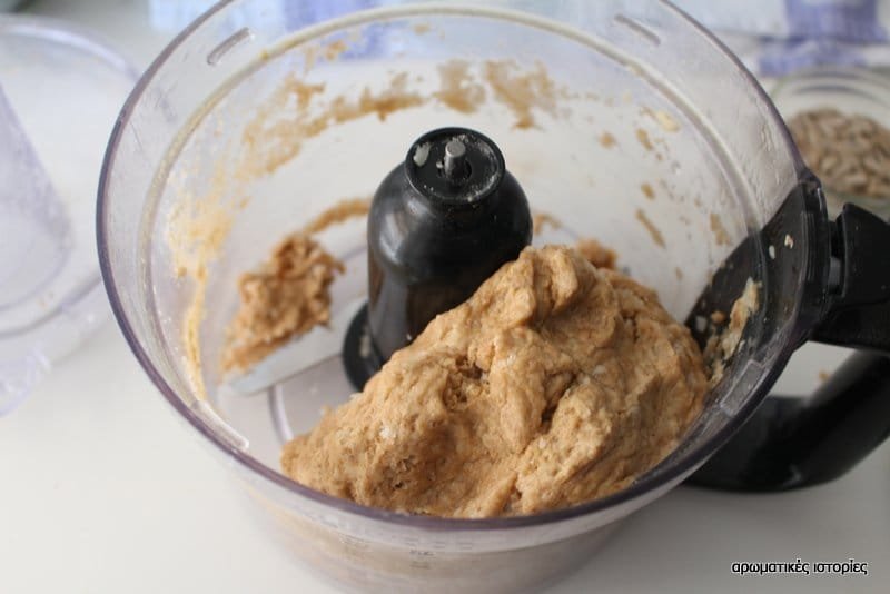 - Κοσκίνισα τα άλευρα τα πρόσθεσα και αυτά μαζί με την κεφαλογραβιέρα και τα ανακάτεψα στο μηχάνημα έως ότου γίνουν μπάλα γύρω από την λεπίδα της μηχανής.