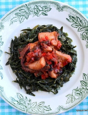 Σουπιές κρασάτες με γιαχνιστά κρίταμα. Cuttle fish with wine sauce and kritama.