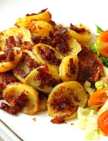 Σνίτσελ με πατάτες και καραμελωμένα κρεμμύδια. Pork schnitzel with caramelized onions and baked potatoes.