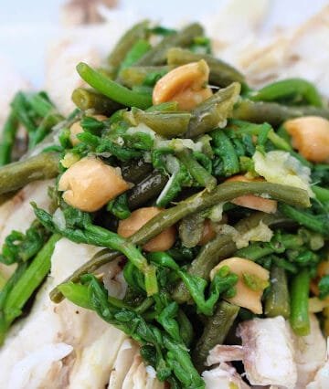 Κεφαλόπουλο με σαλάτα από αμπελοφάσουλα και καρδαμίδες. Μαγείρεμα στη Σαντορίνη. Mullet with salad of beans and kardamides greens. Cooking in Santorini.