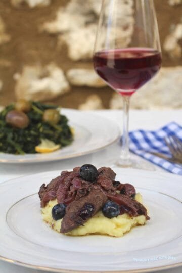 Συκώτι με τσάπουρνα και πουρέ πατάτας. Liver with tsapourna (wild plums) and mashed potatoes.
