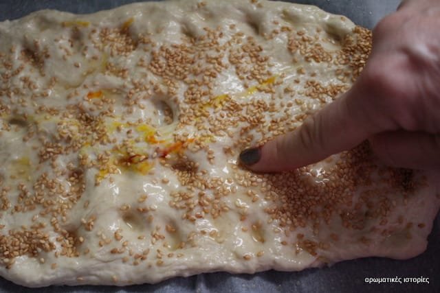 • Στρώνω με λαδόχαρτο το ταψί μου. Πασπαλίζω το χαρτί με σουσάμι για να έχει η λαγάνα και από κάτω κρατσανιστά σποράκια. Ζυμώνω απαλά τη φουσκωμένη ζύμη την πατώ καλά με το χέρι μου και την απλώνω στο ταψί και προσέχω να μην έχει ύψος πάνω από ένα εκατοστό. Κάνω με το δάχτυλό μου βαθουλώματα για να δώσω τη χαρακτηριστική ανώμαλη επιφάνεια της λαγάνας. Ανακατεύω το μέλι με το νερό, αλείφω τη λαγάνα και την πασπαλίζω με το σουσάμι.