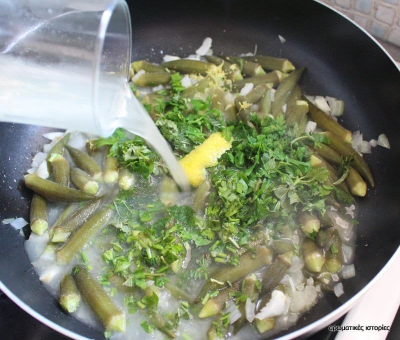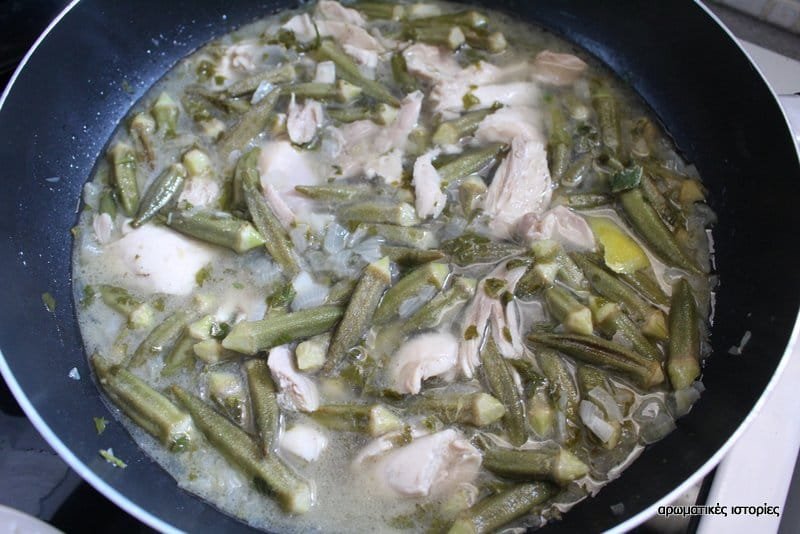 - Χοντροκόβω το κρεμμύδι και το αχνίζω στο ελαιόλαδο για λίγα λεπτά. Προσθέτω σιγά σιγά τις μπάμιες, τα αρωματικά, το ξύσμα, το χυμό και δύο φλιτζάνια από το ζωμό του κοτόπουλου.