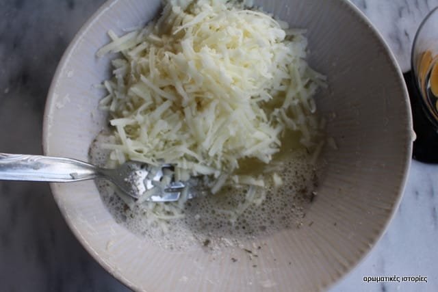 - Ετοιμάζω τη γέμιση όση ώρα η ζύμη ξεκουράζεται. Χωρίζω τους κρόκους από τα ασπράδια. Τρίβω το κασέρι για τη γέμιση και το ανακατεύω με τα ασπράδια και το θυμάρι.