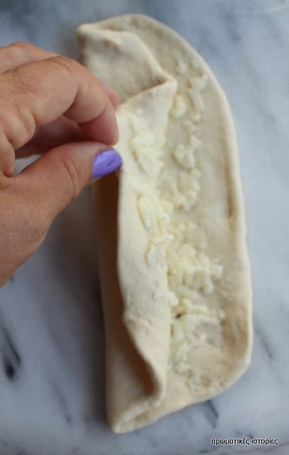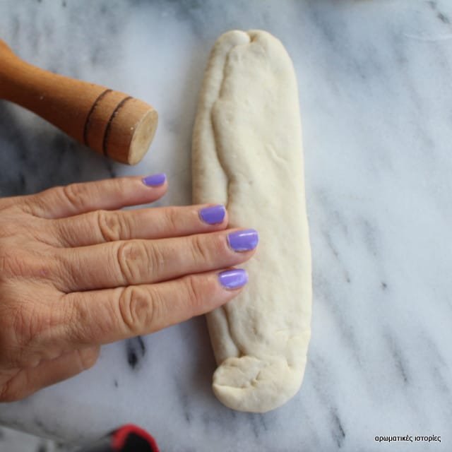 - Χωρίζω το ζυμάρι σε 8 κομμάτια, περίπου 70γρ το κάθε ένα. Προσπαθώ να χωρίσω τη γέμιση στα οχτώ για να κινηθώ πιο γρήγορα. Ανοίγω το κάθε κομμάτι σε ένα παραλληλόγραμμο όσο γίνεται πιο λεπτό. Απλώνω πάνω στο φύλλο μία κουταλιά γέμισης και κλείνω καλά γύρω γύρω σχηματίζοντας ένα στενόμακρο μπαστούνι. Συνεχίζω και με τα υπόλοιπα.