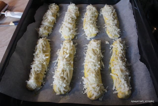 - Ακουμπώ τα μπαστούνια πάνω στο ταψί και τα αλείφω με το μίγμα των κρόκων. Πασπαλίζω με κασέρι και με θυμάρι και ψήνω για 15΄. Αφήνω τα μπαστούνια μέσα στο φούρνο για άλλα 5΄.