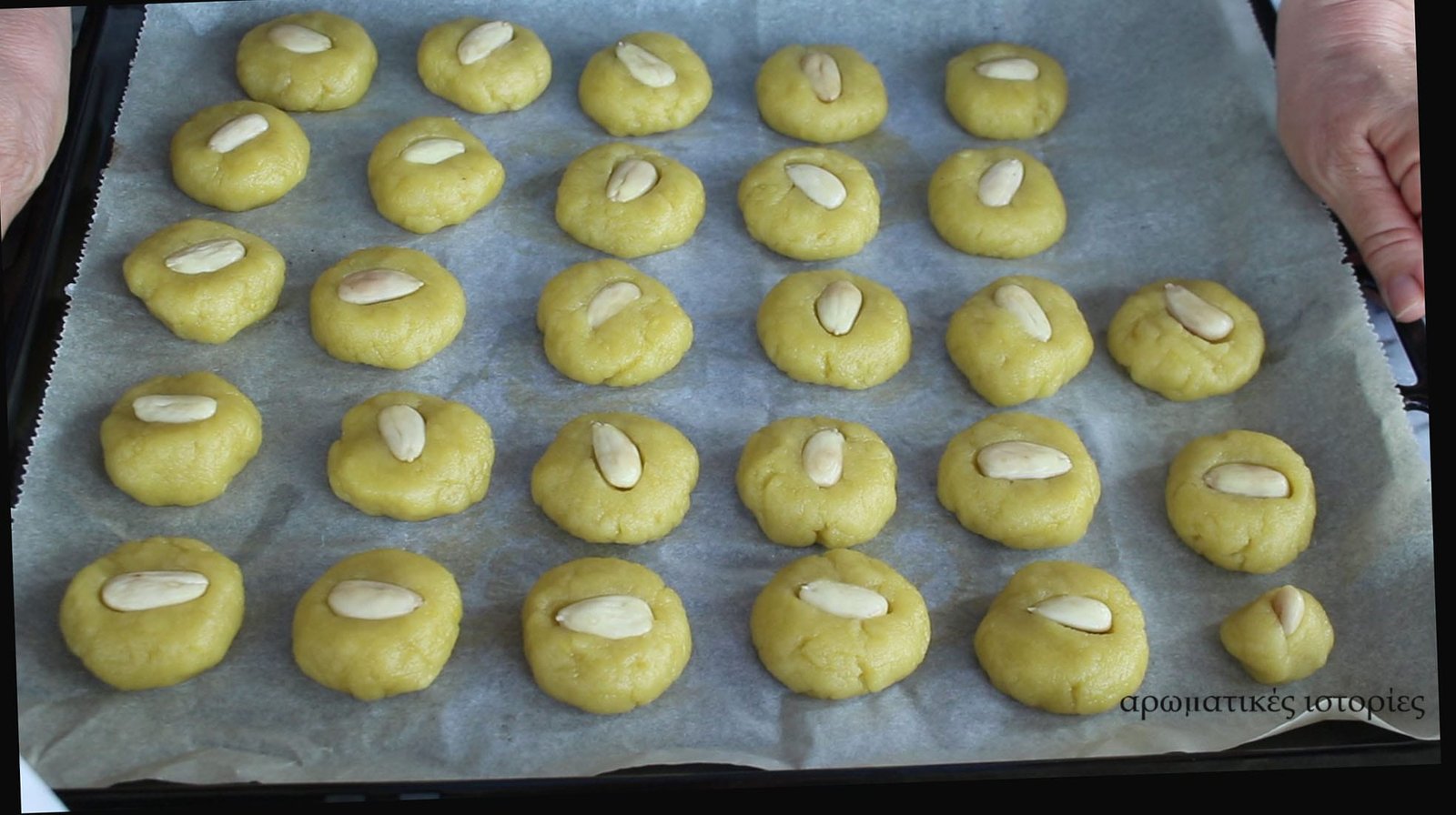 • Ζυγίζω μπαλάκια των 30γρ, βάζω λαδόχαρτο στο ταψί και τα στολίζω με το αμύγδαλο.