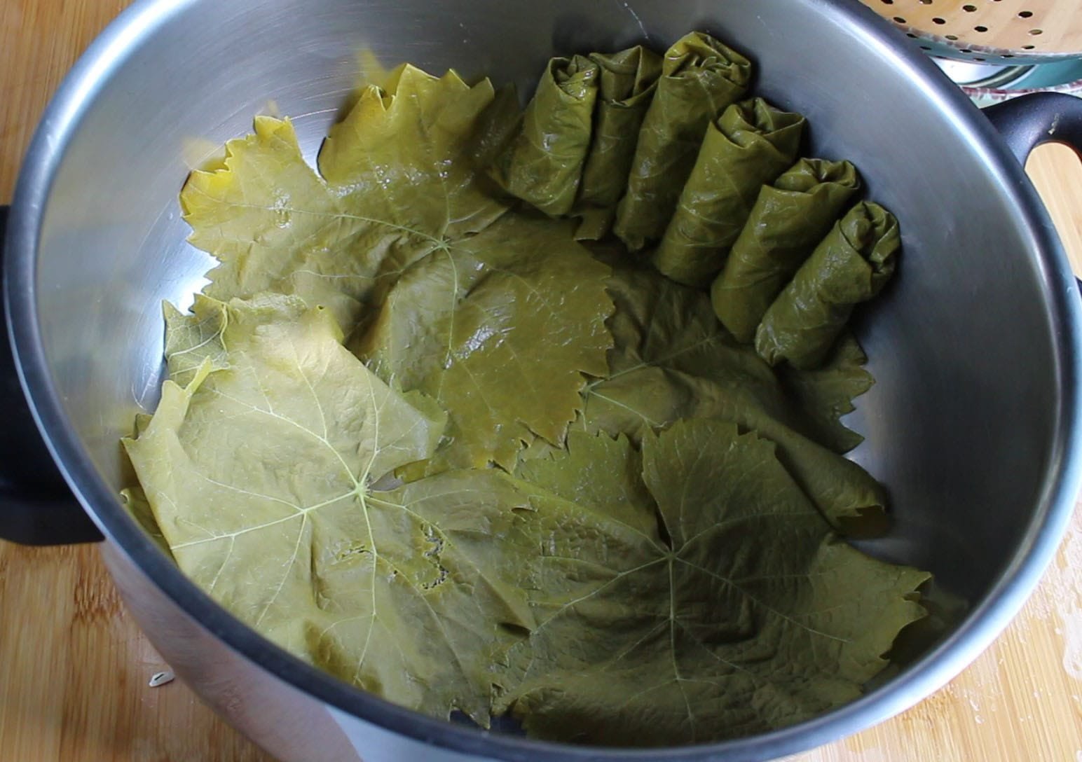 - Στρώνω στον πάτο της κατσαρόλας 5-6 αμπελόφυλλα.