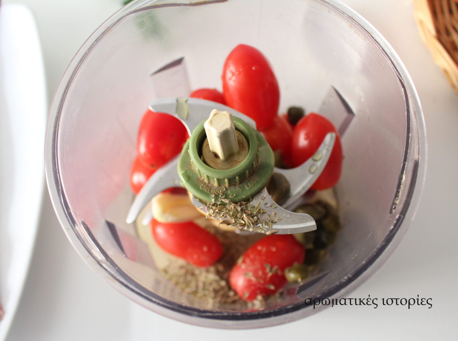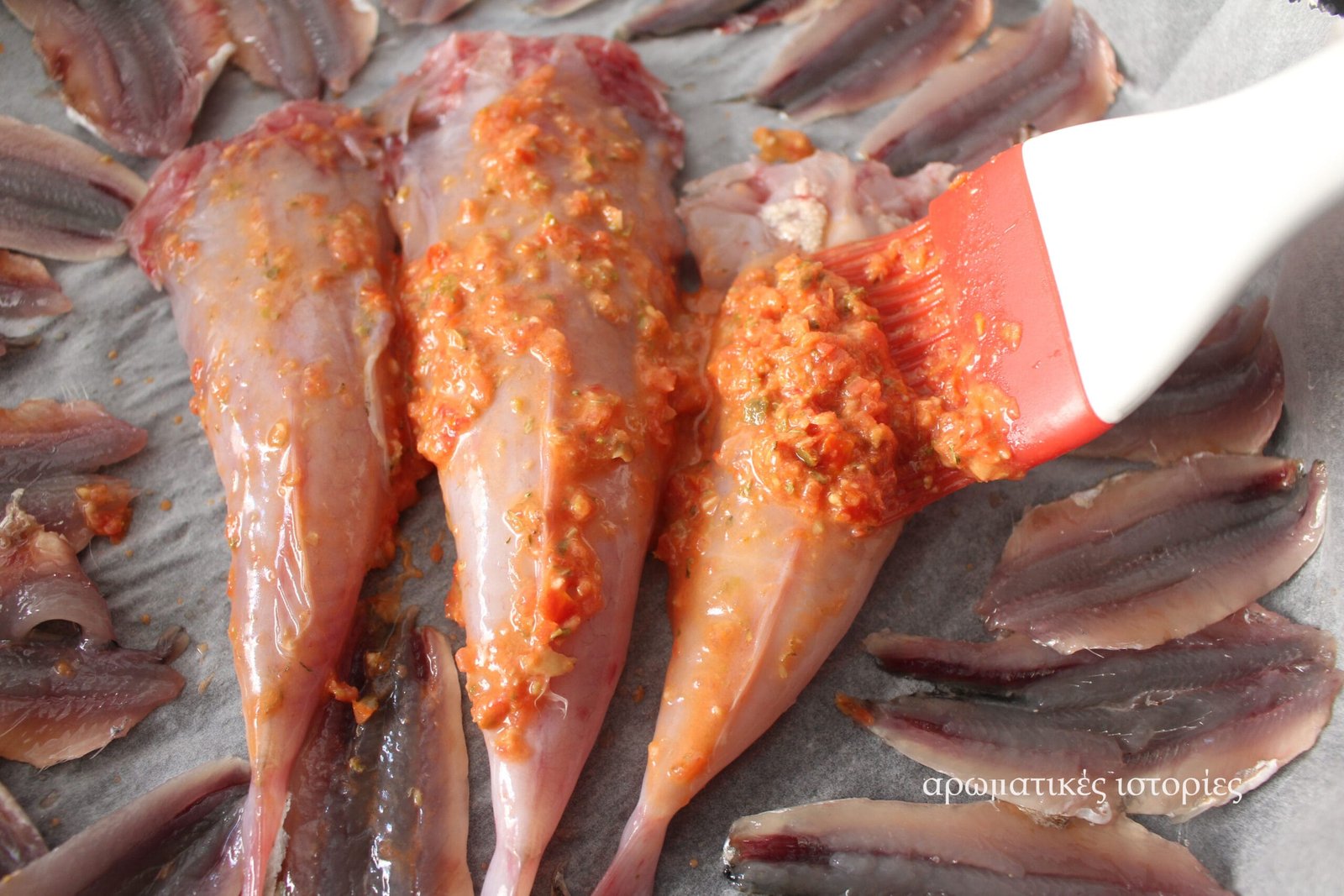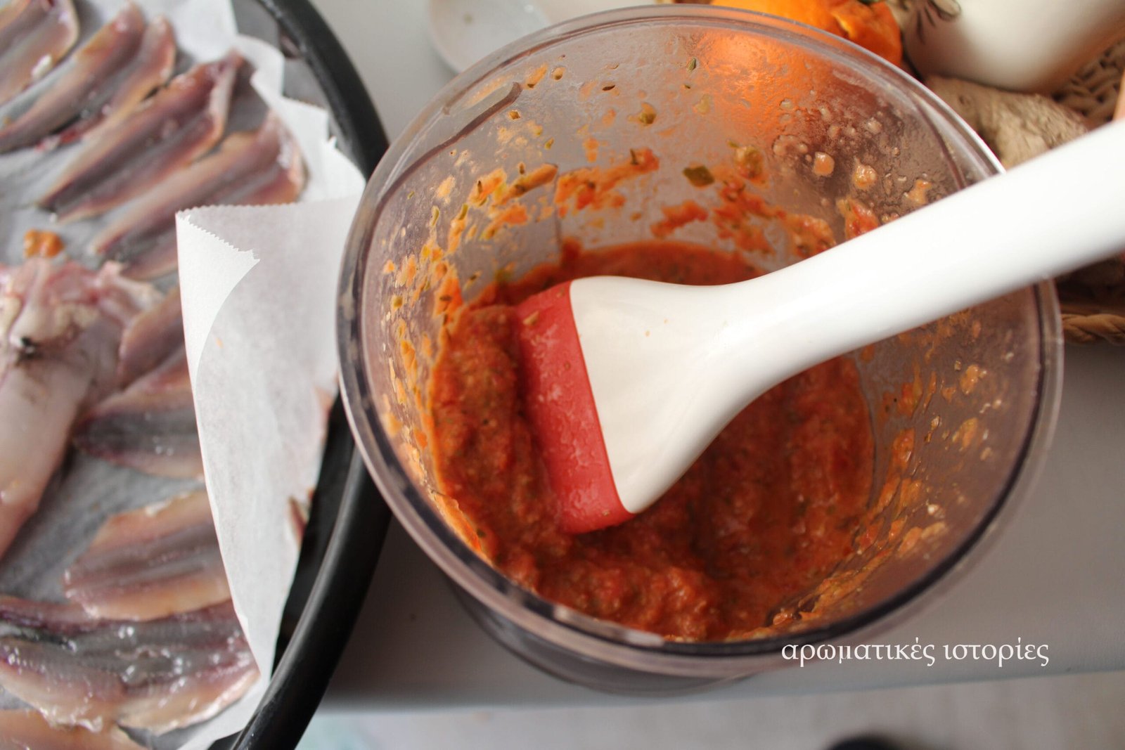 • Αλέθω όλα τα υλικά της σάλτσας στον πολυκόφτη και αλείφω τα ψάρια.