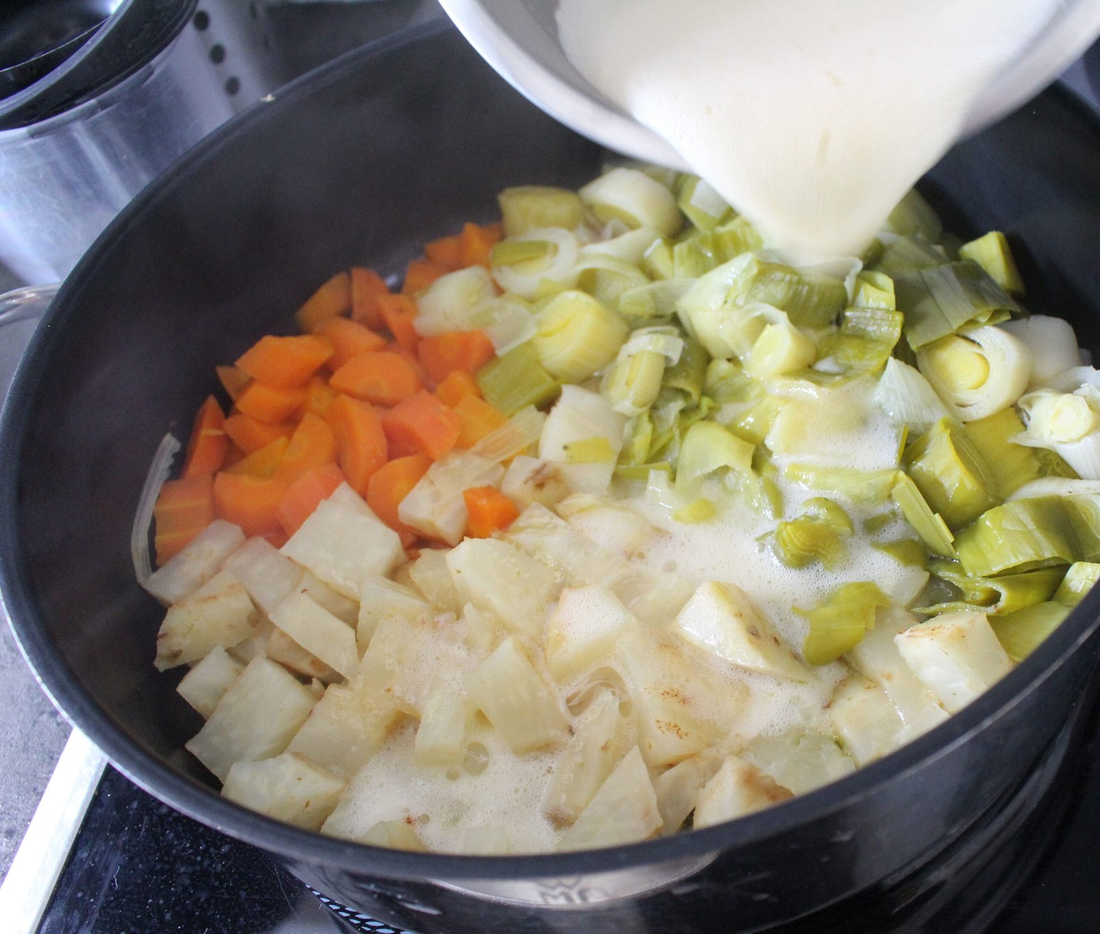 - Βάζω όλα μαζί τα λαχανικά με 1 φλιτζάνι νερό, αλάτι και πιπέρι, να σιγοβράσουν για 20΄. Δοκιμάζω και αν έλιωσαν, βάζω τη θερμοκρασία στο μισό (με υψηλότερη την τρία) και προσθέτω το ελαιόλαδο.