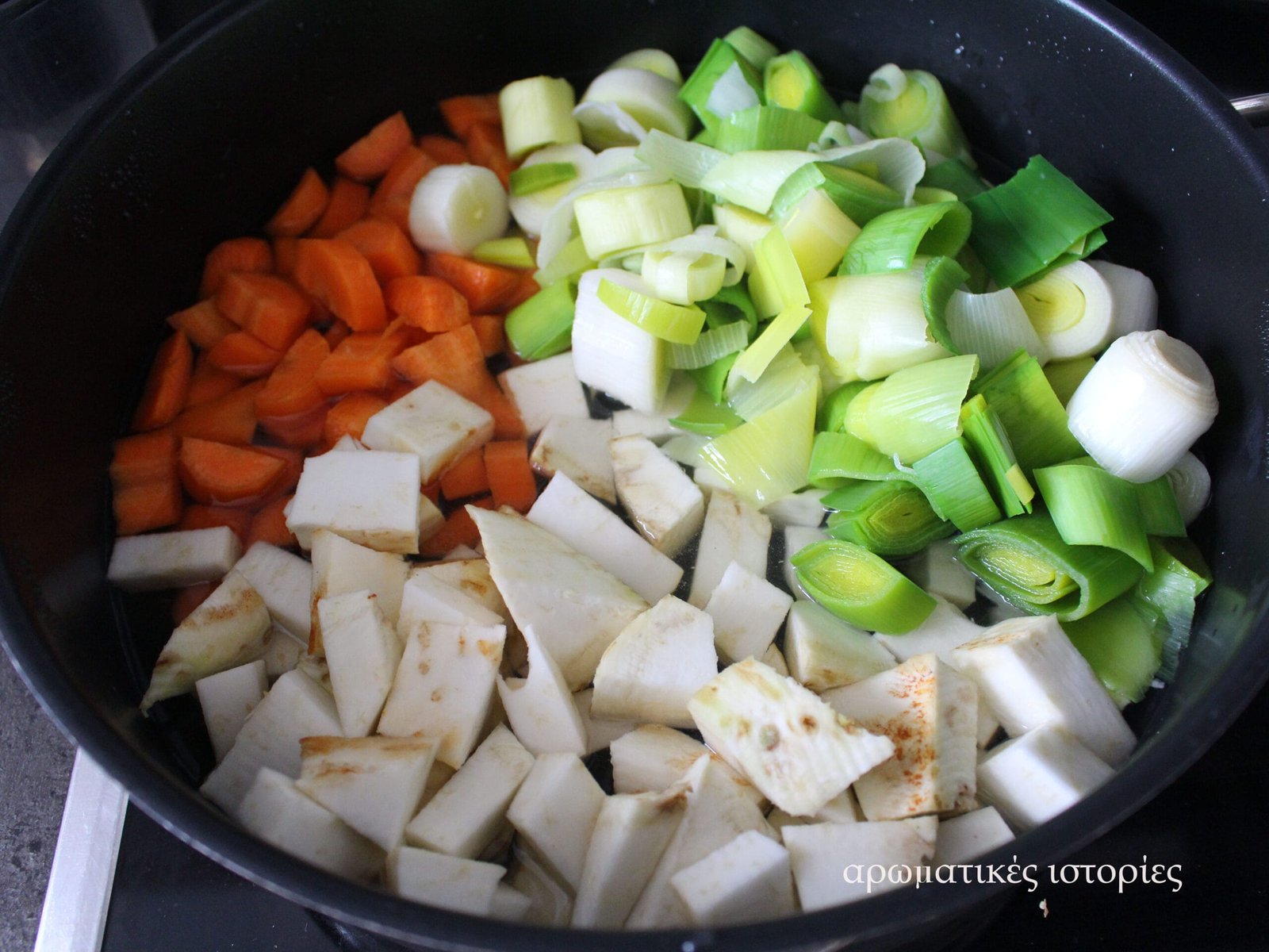 - Καθαρίζω, πλένω και κόβω σε καρεδάκια, το σέλινο και το καρότο.