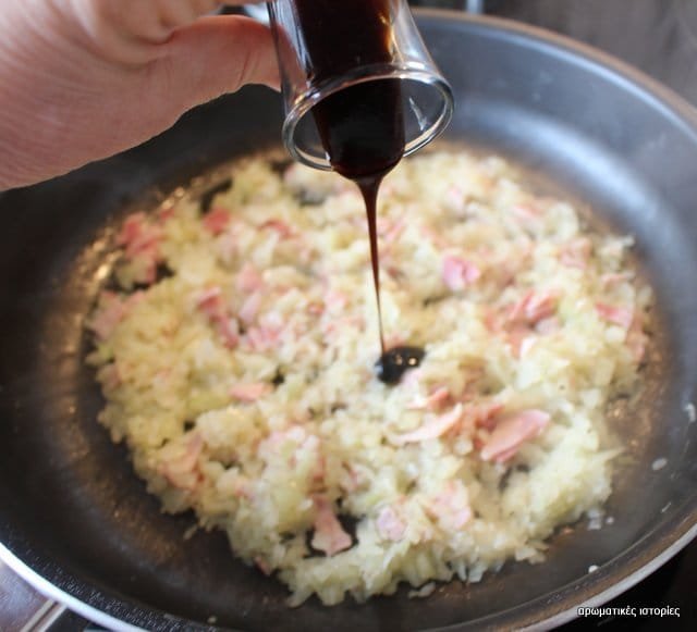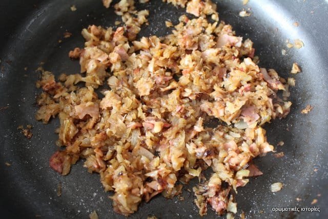• Ενώ μαρινάρονται τα κρέατα μέσα στο γάλα ετοιμάζω τα κρεμμύδια. Καθαρίζω τα κρεμμύδια τα πλένω και τα χοντροαλέθω στον πολυκόφτη. Τα αλατίζω και τα αχνίζω για μερικά λεπτά σε δύο κουταλιές ελαιόλαδο, προσθέτω την μπριζόλα την οποία έχω ψιλοκόψει αρκετό μαύρο φρεσκοαλεσμένο πιπέρι και ανακατεύω για να μη καούν για 3-4 λεπτά. Προσθέτω το βούτυρο και το ξίδι και συνεχίζω μέχρι να πάρουν ωραίο χρώμα, περίπου 3 λεπτά.
