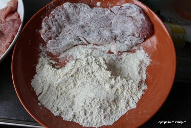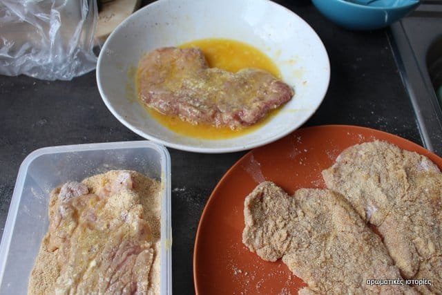 Η διαδικασία είναι η εξής: Βάζω το κρέας πρώτα στο αλεύρι, στη συνέχεια στα αβγά και τέλος στην τριμμένη ψίχα του ψωμιού.