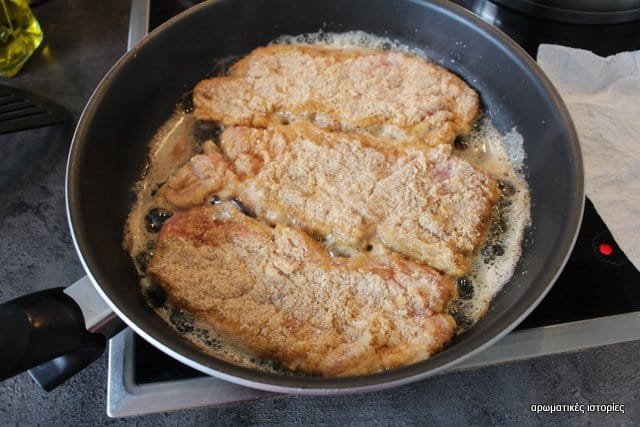• Τηγανίζω τα τρία από τα τέσσερα σνίτσελ, επειδή τόσα χωρούσε το τηγάνι μου,  σε μέτρια φωτιά για 5΄από την μία πλευρά και 5΄από την άλλη. Ακουμπώ τα τηγανισμένα σνίτσελ πάνω σε χαρτί κουζίνας για να απορροφήσει τα περιττά λίπη. Συνεχίζω το τηγάνισμα με αυτό που έμεινε, αφού προσθέσω λίγο ελαιόλαδο.
