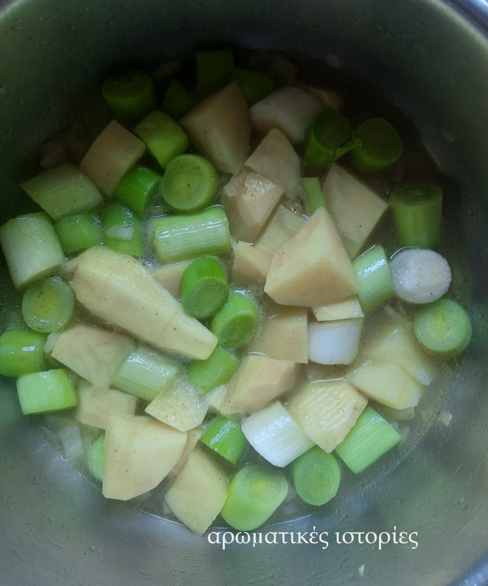 - Καθαρίζω, πλένω και χοντροκόβω όλα τα λαχανικά. Βάζω το ελαιόλαδο στην κατσαρόλα και αχνίζω καλά καλά όλα τα υλικά.