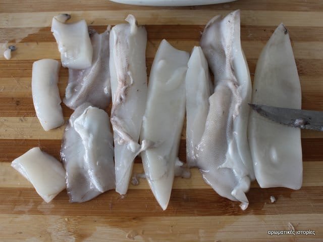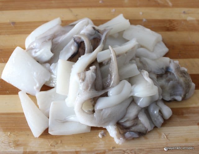 Πλένω καλά τη σουπιά και προσπαθώ να βγάλω όσο γίνεται τις πετσούλες, απλά και μόνο για λόγους καθαρά αισθητικούς. Κόβω τη σουπιά σε λωρίδες και στη συνέχεια σε μικρά κομμάτια. Σε αυτή τη φάση αν δε σας αρέσει μαστιχάτη η φρέσκια σουπιά, μπορείτε να την βράσετε για 20 λεπτάκια για να είναι πιο μαλακή. Αλλιώς την αφήνετε όπως έχει.