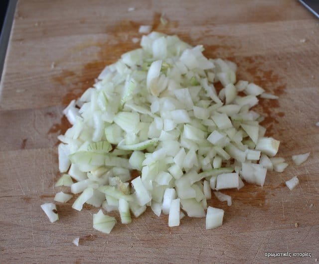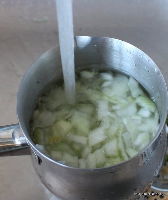 - Καθαρίζω, πλένω και ψιλοκόβω το κρεμμύδι. Βάζω το κρεμμύδι σε βραστό νερό, το στραγγίζω και το ξεπλένω με κρύο νερό.