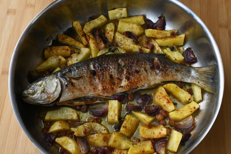 Baked Topani fish with grapes and potatoes