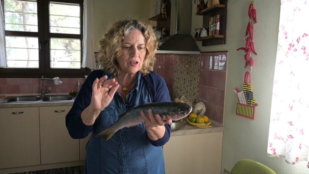 • Το ψάρι το είχε ήδη καθαρίσει ο ψαράς και εγώ απλά το έπλυνα καλά για να φύγουν κάποια από τα μεγάλα στρόγγυλα λέπια που είχαν μείνει.  Αλατίζω με χοντρό αλάτι το ψάρι και το αφήνω για κάποια ώρα για να νοστιμίσει.