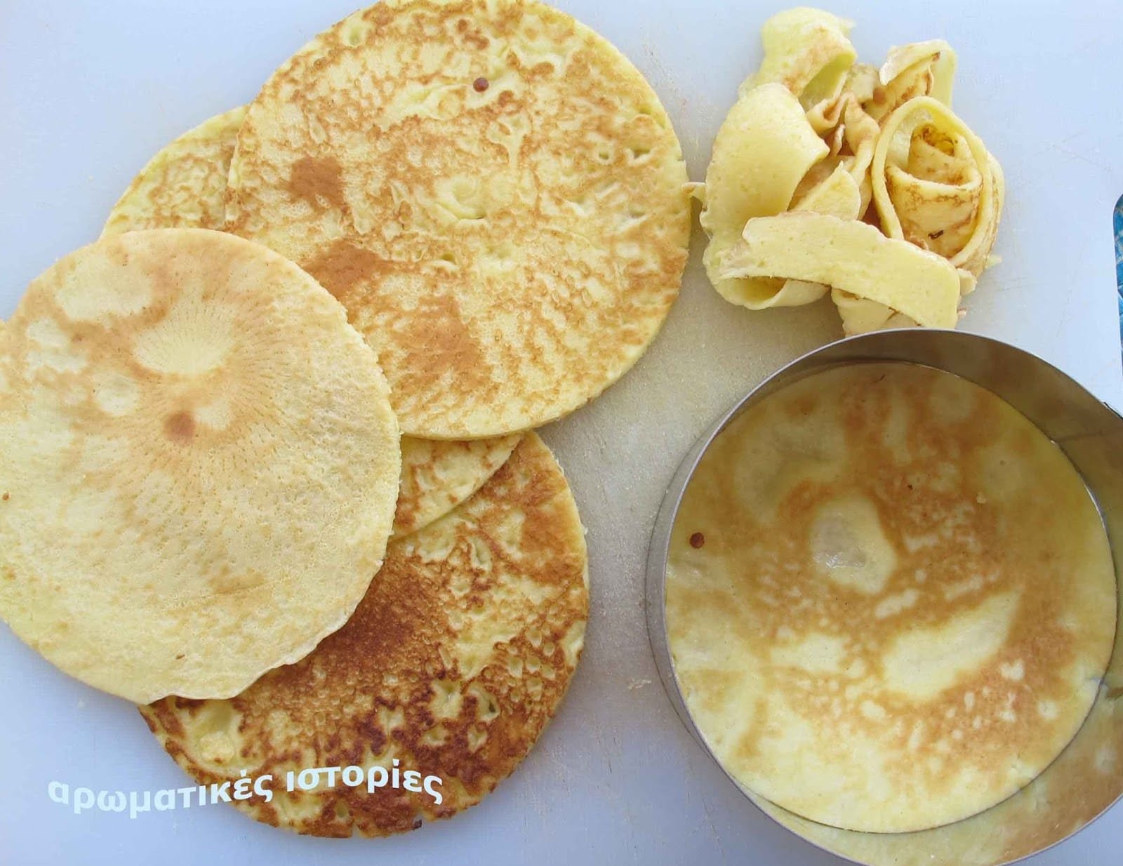 - Συνθέτω την τούρτα: κόβω τις κρέπες στρογγυλές με τη βοήθεια μίας μέτριας φόρμας ‘τσέρκι’.