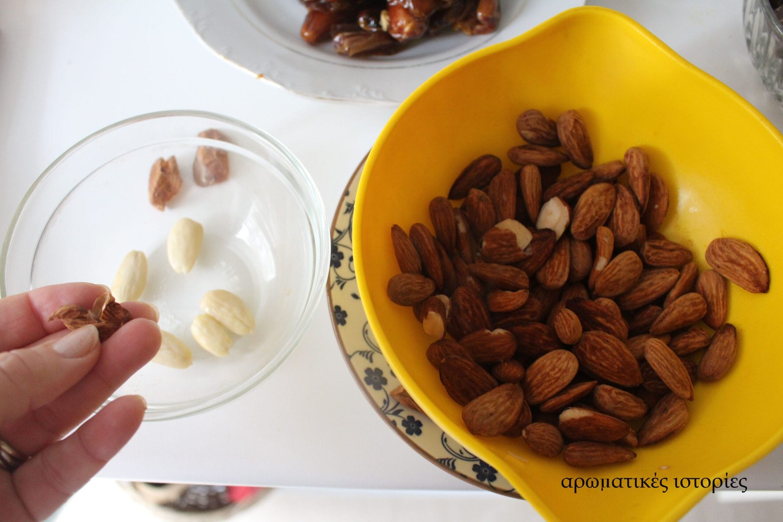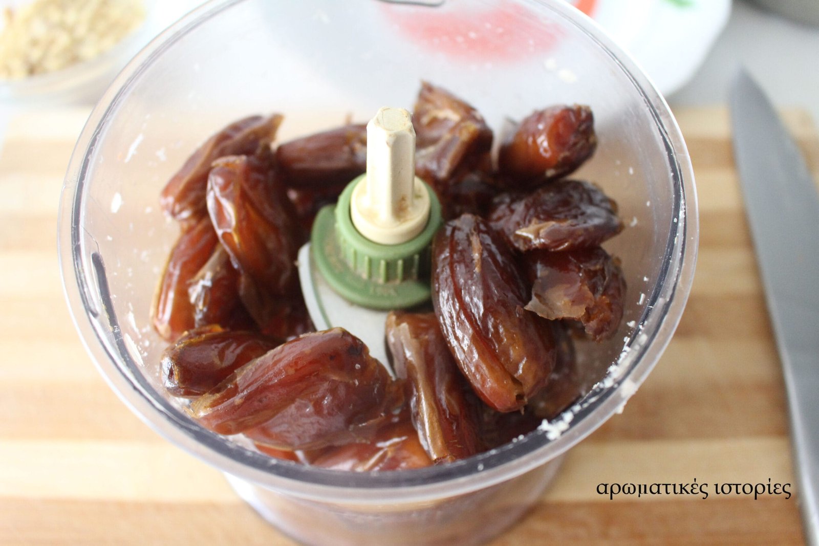 - Αλέθω στον πολυκόφτη πρώτα τα αμύγδαλα, τα βγάζω και στη συνέχεια αλέθω τους χουρμάδες.