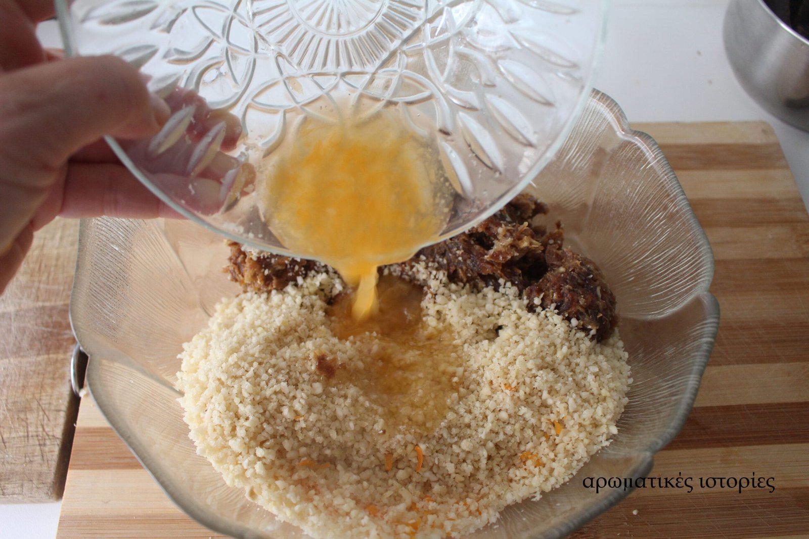 - Βάζω να πάρουν μία βράση τα αμύγδαλα και τα ξεφλουδίζω. Σπάζω τα καρύδια και τα ψιλοκόβω. Βγάζω το κουκούτσι από τους χουρμάδες. Ξύνω το μανταρίνι και το στύβω.
