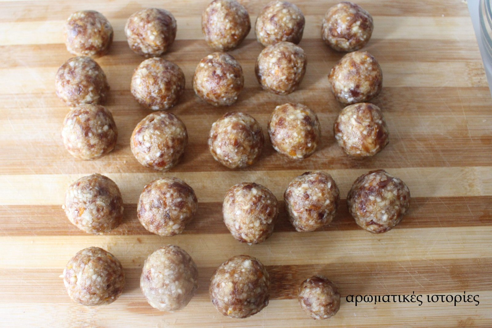 - Βάζω σε ένα μπολ τα αμύγδαλα, τους χουρμάδες, το ξύσμα, το μέλι και 2 κουταλιές χυμό μανταρινιού. Ανακατεύω βρέχοντας τα χέρια μου με το χυμό και πλάθω τα μπαλάκια σε 21γρ, ζυγίζοντάς τα. Θα μπορούσα να αποφύγω αυτή τη φάση αλλά το έχω συνηθίσει και το κάνω σχεδόν μηχανικά.
