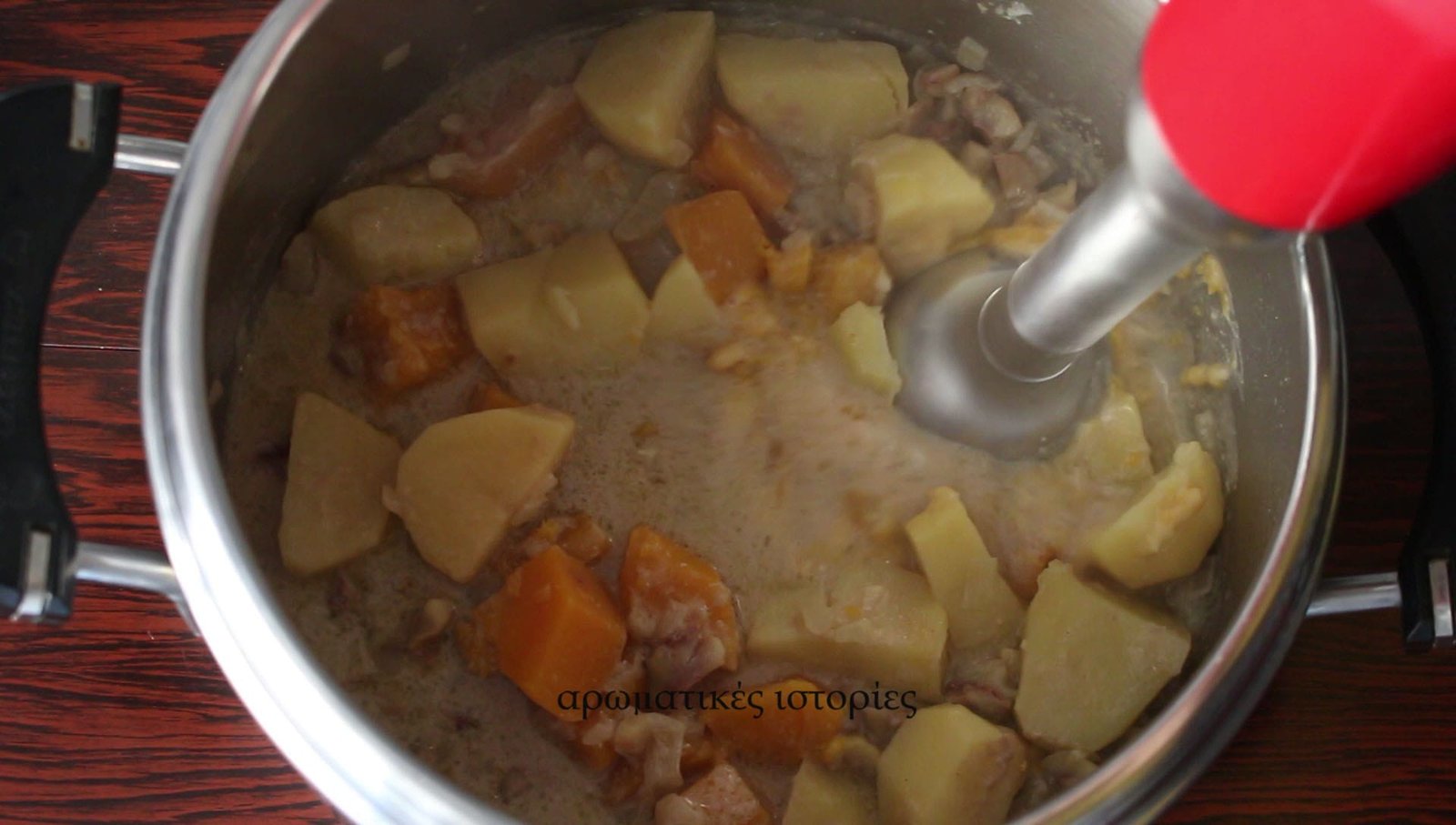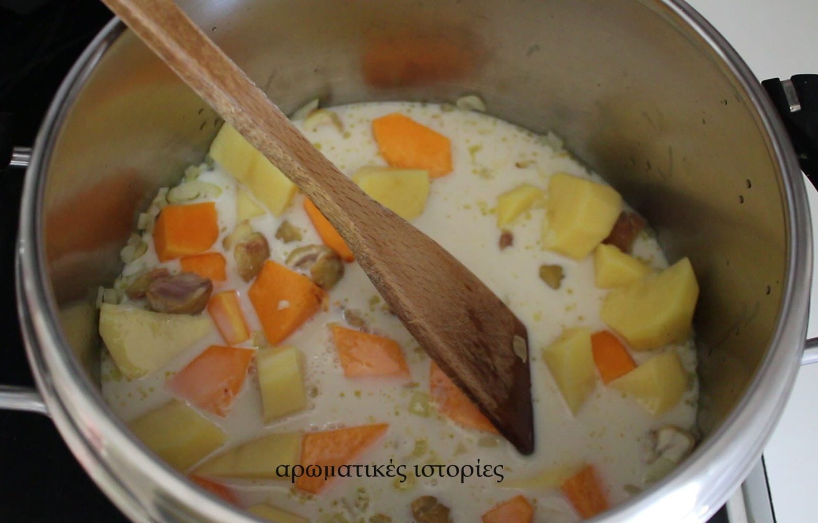 • Προσθέτω την κολοκύθα, τις πατάτες, τα κάστανα και το γάλα βρώμης και ανακατεύω.