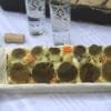 του πελτέ. Στήνω στρώσεις ψαριού και πατατοσαλάτας. Σερβίρω μαζί με τα χαβιαράκια και πασπαλίζω με μπούκοβο.