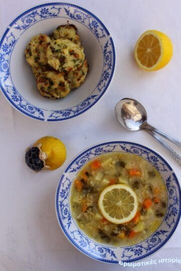Λεμονάτη σούπα χελιδονόψαρου και ψαρομπιφτεκάκια με άσπρη σάλτσα. Flying fish lemon soup, fish balls and white rice sauce.