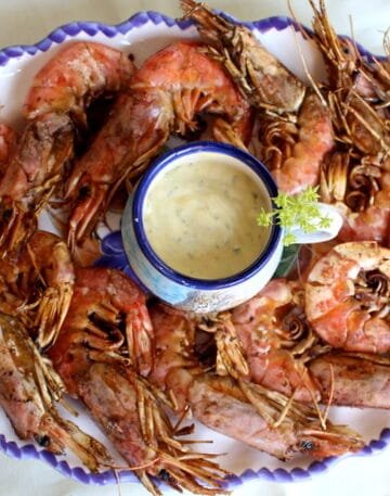 Γαρίδες στα κάρβουνα και σκορδάτη μαγιονέζα με κρίταμα. Barbecued shrimps and mayonnaise sauce with sea fennel and garlic.