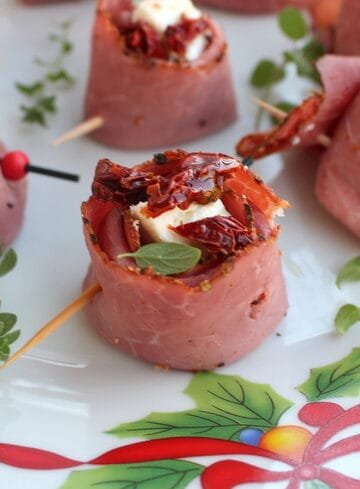 Φωλιές από παστράμι με φέτα και λιαστές. Pastrami beef with feta, dried tomatoes and greek oregano.