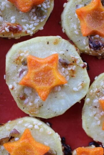 Ψητές ροδέλες γλυκοπατάτας με σουσάμι, κεφαλοτύρι, καρότα και δίκταμο. Roasted sweet potato rounds with sesame, dittany of Crete, kefalotyri cheese and carrots.