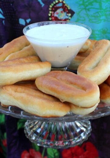Λαλάγγια και αλοιφή τυριού με σουμάκι. Lalanghia (strips of dough fried in extra virgin oil) and cheese sauce with sumac.
