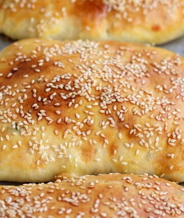 Πίτες με κεφαλογραβιέρα, αλλαντικό και αφράτη μυρωδάτη ζύμη. Pies with kefalograviera cheese, turkey ham and fluffy aromatic dough.