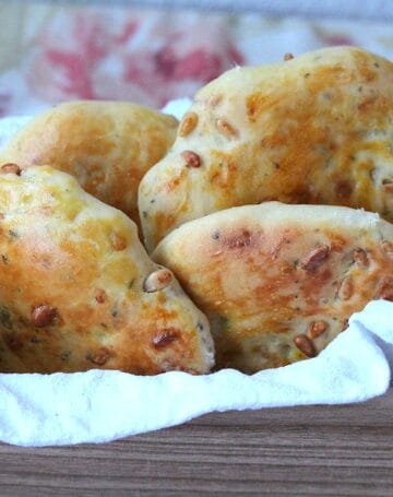 Πλατιά παραδοσιακά ψωμάκια με κουκουνάρια και θρούμπι. Traditional flat little breads with savory of Crete and pine nuts.