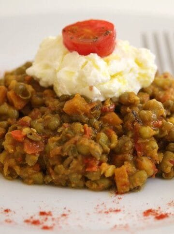 Ροβίτσα απλή με ντομάτα, κόκκινη πιπεριά και ξύγαλο. Rovitsa, mung beans, with red peppers, tomatoes and xygalo cheese.